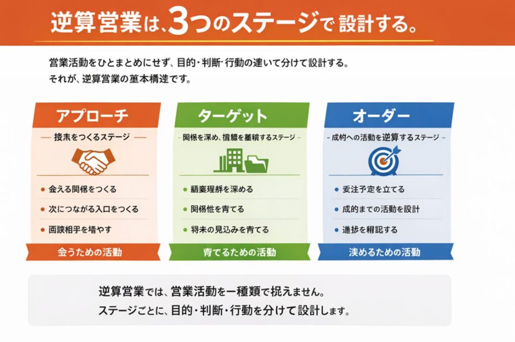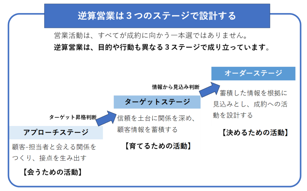 逆算営業は、営業活動を3つのステージに分けて設計します。