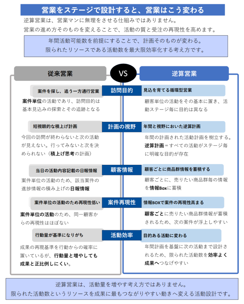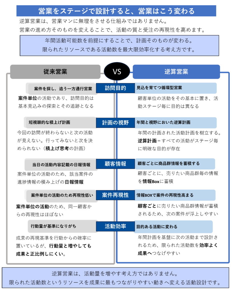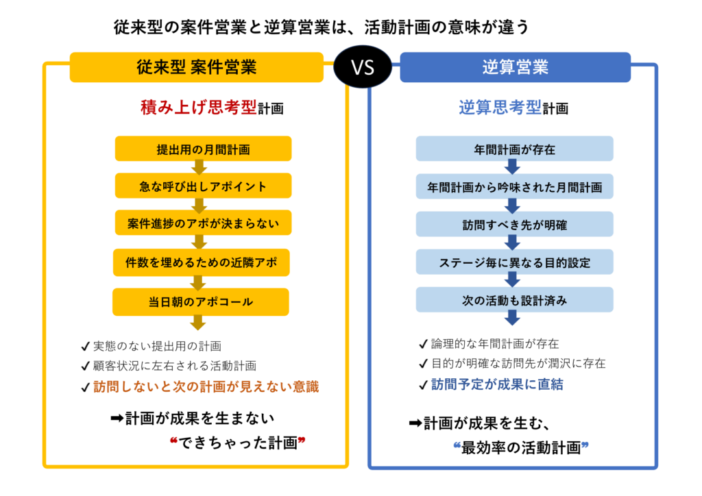 逆算営業の計画は、活動目的と活動順序が設計されているため、計画そのものが成果に近づく設計になります。
