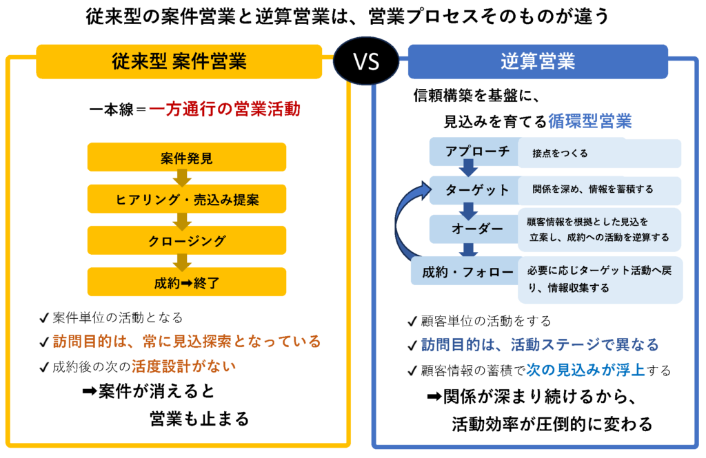 従来型案件営業と逆算営業は、営業プロセスそのものが違います。